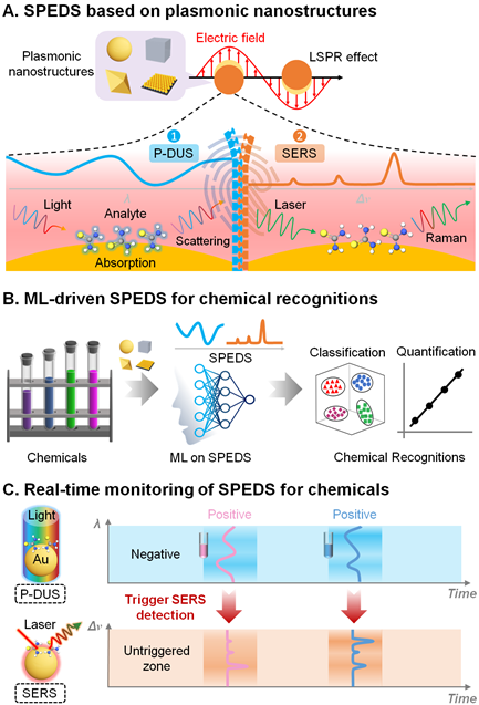 广谱性的快速识别和实时监测危险化学品对防范安全事故、保护环境与公共健康具有重要意义。然而,这一目标的达成对检测技术的要求较高:痕量浓度需要极高的灵敏度,结构相似物质的区分需要分子水平的特异性,而动态的现实环境需要快速实时的响应能力。传统的气相色谱法和质谱法等分析技术具有较高的精度和灵敏度,但分析仪器庞大且操作高度专业化,使得其无法在动态环境下便携应用。而电化学、荧光等便携式分析方法在检测灵敏度、广谱性和定量分析能力方面尚存欠缺。