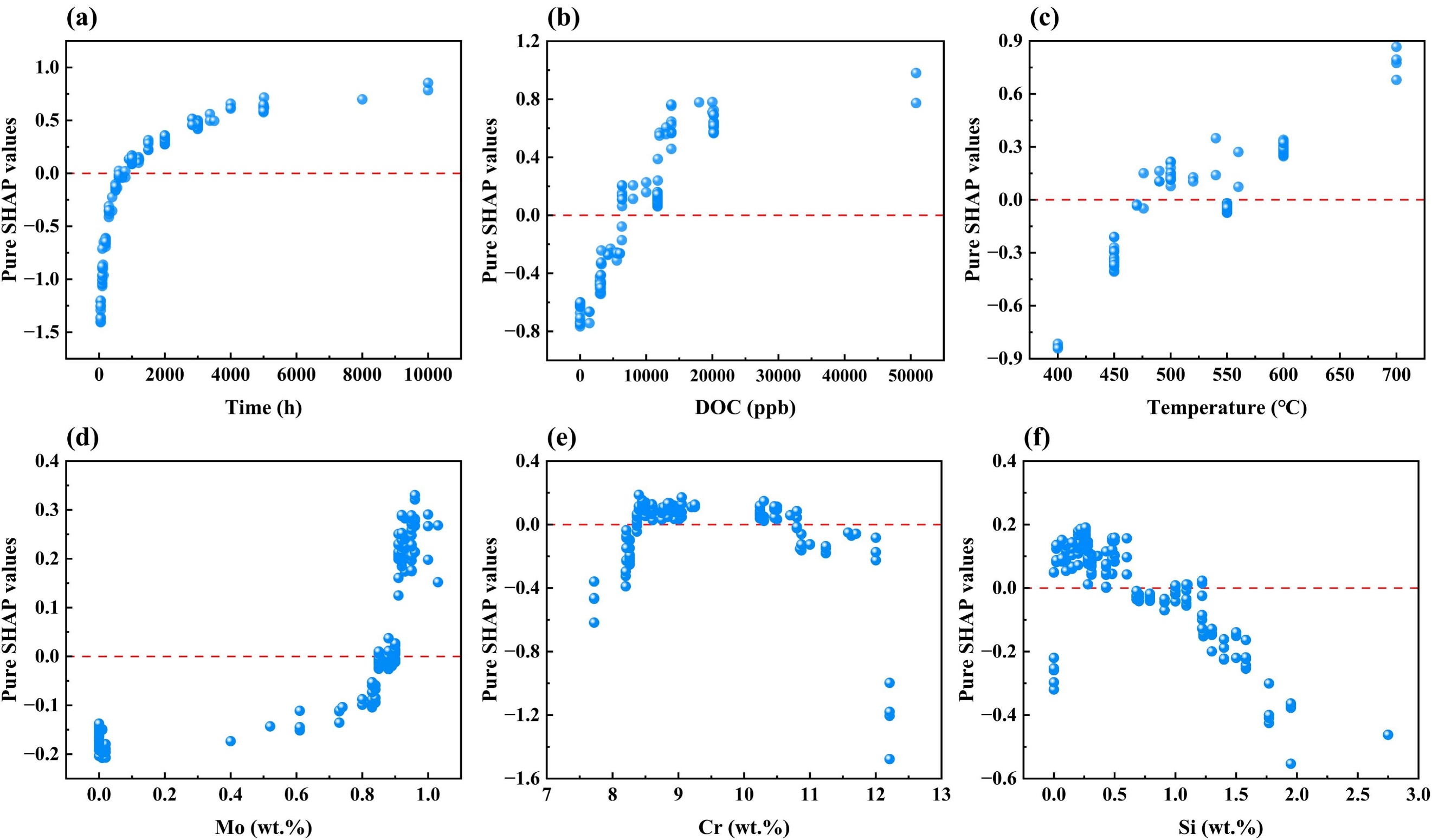 在数据驱动建模方面,研究人员提出了一种可解释的机器学习(ML)模型,用于预测F/M钢在静态LBE环境中的氧化腐蚀行为,并建立了合金成分、测试条件与氧化膜厚度之间的定量关联。通过算法比较与特征筛选,构建了包含9个关键特征的梯度提升回归(GBR)模型。为增强模型的可解释性,研究引入SHAP方法,量化重要特征的独立贡献及其非线性交互效应,明确了Mo、Cr和Si等关键元素的最佳含量范围,并据此提出多元素协同优化策略,为合金设计提供了指导依据。该研究为液态金属腐蚀行为预测与抗氧化合金设计提供了新思路,突破了传统模型在处理非线性复杂关系和机器学习模型在解释性方面的局限。论文第一作者为核能安全所博士研究生邓呈敏,通讯作者为郑明杰研究员和上海大学熊杰助理研究员。该研究得到了国家自然科学基金企业创新联合基金、国家重点研发计划和中国科学院战略性先导科技专项等项目的资助。