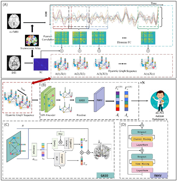 理解大脑的复杂活动需要同时关注功能协调和结构解剖。然而,现有的脑网络学习模型在处理动态建模和多模态信息融合方面仍存在局限。为克服这些挑战,科研团队受大语言模型架构(特别是RWKV架构)的启发,开发了ET_MGNN模型。该模型的核心创新点包括:通过时间滑动窗口技术,将反映脑区同步性的动态功能连接(DFC)与提供物理约束的结构连接(SC)进行自适应融合,构建出更全面的动态大脑图序列;创新性地引入了RWKV模块,该模块结合了循环神经网络(RNN)捕获长程依赖的能力和Transformer并行计算的高效性,能够更精准地模拟大脑在不同功能状态间的动态切换;引入了GASO图读取模块,能够识别出与疾病高度相关的关键脑区,为临床诊断提供直观的生物标志物。