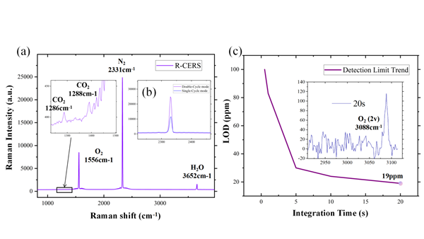 为了进一步挖掘探测潜力,团队在光路末端引入了一个回溯反射器,构建了“双周期”光路。激光在腔内完成第一圈反射后,被原路反射后进行第二圈传输,有效光程直接翻倍。该设计不仅利用了前向散射信号,还“回收”了通常被浪费的后向散射信号。实验表明,相比单周期模式,双周期设计的拉曼信号强度提升了约2.3倍,信噪比(SNR)提升了约2倍。