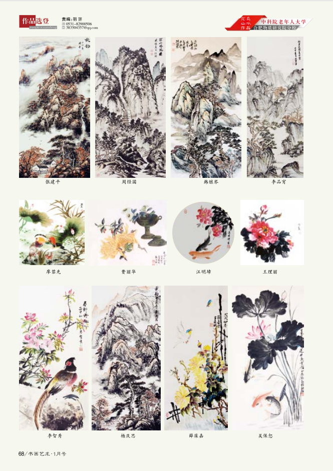 老年大学书画班学员作品登上《老年教育》杂志 发布时间:2020-01-09 作者:清溪 【打印】 【小 中 大】 【关闭】 【关闭】 2020年1月,《老年教育》杂志刊登了合肥研究院老年大学书画班学员的部分优秀作品,向全国关注老年教育的读者展示合肥研究院老年大学书画班的作品风采。合肥研究院老年大学为学员们搭建了优秀的学习平台,学员们在长期的书画实践中,通过对中国书画艺术传统美学的学习、研究、吸收和借鉴,创作出许多优秀的书画作品,在安徽省老年书画爱好者中有一定的影响力。 获刊作品 老年大学书画班授课与布展花絮