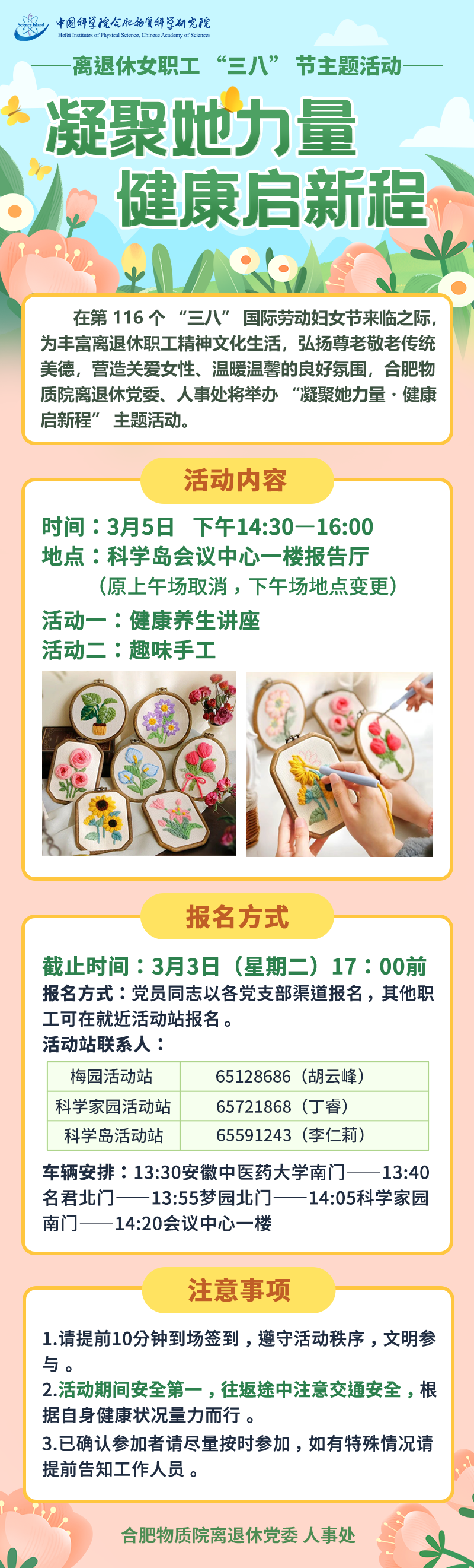 关于变更“凝聚她力量·健康启新程”离退休女职工“三八”节主题活动时间和地点的通知 发布时间:2026-03-02 作者: 【打印】 【小 中 大】 【关闭】 【关闭】 因科学家园离退休活动站临时停电,原定于3月5日(星期四)举办的“凝聚她力量·健康启新程”离退休女职工“三八”节主题活动,现时间统一调整为当日下午14:30-16:00(原上午场取消),地点调整为科学岛会议中心一楼大报告厅。由此给您带来的不便敬请谅解。欢迎广大离退休职工踊跃参加,共庆佳节!具体内容详见下方海报。