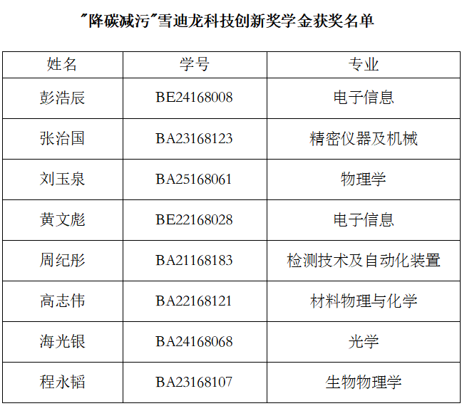 根据中国科学技术大学《关于推荐评选2025年"降碳减污"雪迪龙科技创新奖学金的通知》要求,经研究生本人申请,合肥物质科学研究院奖学金评定委员会评审,彭浩辰等八位研究生拟通过初选,现将名单进行公示,公示期:2026年1月15日-2026年1月19日,如有异议,请在公示期内实名联系研究生处。