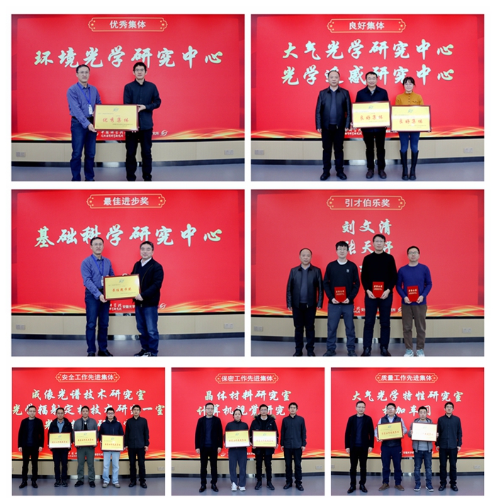 在表彰环节,党委书记赵南京宣读了《关于安徽光机所2025年度考核表彰的决定》。副所长司福祺宣读了安全、保密、质量工作先进表彰决定。所领导集体为获奖部门、获奖代表颁奖。