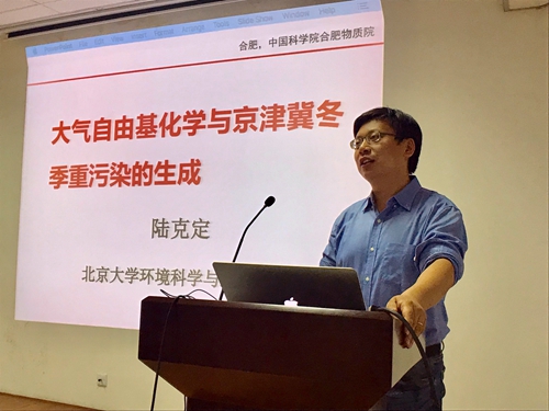 陆克定研究员主要研究方向为大气自由基化学,基于自由基直接观测和动力学模拟等研究手段,关注典型城市环境中大气自由基的来源和转过以及相应大气化学机制的研发,致力于从化学的角度解读区域二次污染的形成机理,为区域二次污染防控提供科技支撑。5月30日,陆克定研究员应邀做了题为《大气自由基化学与京津冀重污染的生成》的学术报告。报告会上,陆克定研究员介绍了所在科研团队开展的探索大气自由基化学与京津冀重污染的生成方面的研究工作。梳理了典型的大气污染模型,指出大气自由基在大气污染中起着一些关键作用,比如自由基可实现一定程度的大气自净功能,但在二次污染物生成中,又起到催化作用。报告认为研究大气自由基化学是研究大气污染的关键要素之一,同时自由基的直接准确测量也是对流层自由基化学的一个研究瓶颈。为此,他的团队开展了基于激光诱导荧光技术的HOx、RO2自由基的外场测量,以及从平流层到对流层OH自由基“非传统”再生机制等研究,建立了自由基化学闭合实验方法体系,在我国城市群区域发现了OH自由基“非传统”再生机制的存在(此机制主要由新发现的RO2氢转移化学组成,在全球尺度上具有普遍性)。