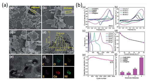 图1. (a) Co/Ni双金属MOFs及其衍生材料的形貌及成分表征;(b) 电容器性能测试及应用稳定性。
