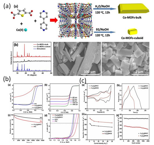 图2. (a) S、N包含钴-MOFs形貌及结构表征;(b) 氧催化反应性能及应用稳定性;(c) 电容器性能测试及应用稳定性。