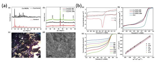 图3. (a) Co-MOFs及其热解产物的形貌及结构表征;(b) 所制备材料的电催化性能测试。