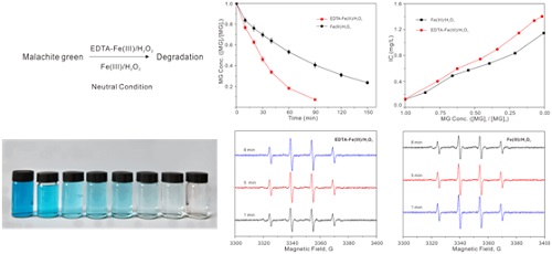 研究人员通过技术攻关,利用EDTA-Fe(III)作为芬顿试剂,降低了Fe(III)/Fe(II)的氧化还原电势(E(Fe(III)/Fe(III)-EDTA) =0.12 V),将芬顿反应体系的最优pH范围拓宽至中性,并减少了铁盐及过氧化氢的投加量,节约了成本,提高了对孔雀石绿降解的效率。这项研究解决了孔雀石绿的难降解问题,拓宽了芬顿反应的pH应用范围,具有广泛的应用前景。