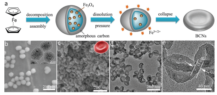 王辉、Miqin Zhang等科研人员以调控药物输送载体的形貌结构为出发点,利用金属有机分子(二茂铁)为前驱体,采用溶剂热法和酸腐蚀等手段制备出“多功能荧光介孔碳基纳米盘”。与碳基纳米球相比,碳基纳米盘展现了更高的体外肿瘤细胞摄取率与体内肿瘤组织聚集率。