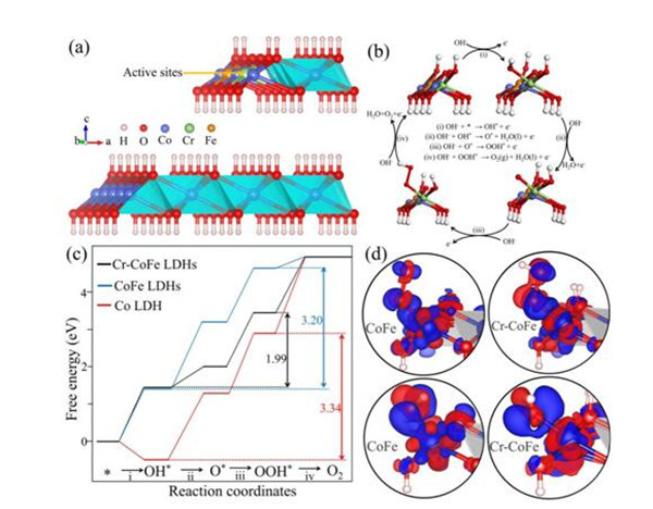 为此,固体物理研究所的研究人员采取低温水热合成法,成功在导电基底上制备得到了Cr掺杂的CoFe水滑石电催化剂。该催化剂在碱性环境中具有非常优异的氧析出性能,当电流密度为10mA/cm2时,其过电势仅为238 mV。此外,该电催化剂经3000次循环伏安和20小时计时电流法测试后,仍然保持良好的稳定性。密度泛函理论(DFT)计算表明,由于Cr和Co的电负性差异,导致催化剂对OOH*的吸附强度显著降低,打破了△GOOH(OOH中间体吉布斯自由能)和△GOH(OH中间体吉布斯自由能)之间的线性关系,从而提高了电催化析氧性能