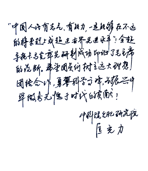 匡光力题词全文为:“‘中国人民有志气、有能力,一定能够在不远的将来赶上或超过世界先进水平!’全超导托卡马克率先研制成功印证了毛主席的论断。希望团员们树立远大理想,团结合作,勇攀科学高峰,为振兴中华做出无愧于时代的贡献!中科院合肥研究院匡光力。”