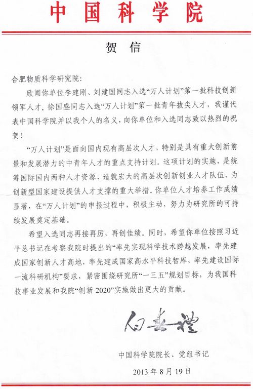 近日,中科院院长、党组书记白春礼发来贺信,祝贺合肥研究院李建刚、刘建国入选“万人计划”第一批科技创新领军人才,徐国盛入选“万人计划”第一批青年拔尖人才。白春礼代表中科院并以个人名义向合肥研究院和入选同志致以热烈的祝贺!