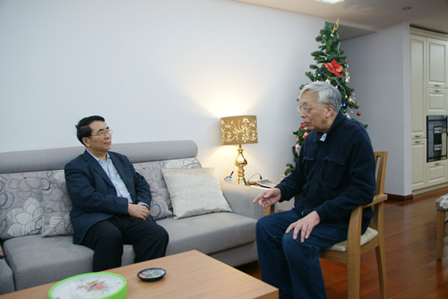 在邱励俭研究员的家中,白春礼向八十一岁高龄的邱先生及其夫人表示了亲切慰问。他先是感谢邱励俭研究员为我国核聚变事业做出的突出贡献,仔细询问了邱先生的身体情况,详细了解了邱先生的退休生活。他对于邱先生退休后还坚持不要报酬长期悉心培养核聚变人才表示很受感动,并提前向邱老拜年,祝他健康长寿。