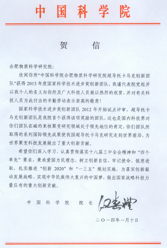 白春礼在贺信中说,国家科学技术进步奖创新团队2012年开始试点评审,超导托卡马克创新团队是中科院首个获得该项奖励的团队,这也是国内科技界对你们团队在磁约束核聚变研究领域处于领先地位的肯定,你们团队所取得的系列国际领先成果使我国超导托卡马克研究走到世界前沿,为世界聚变科技发展做出了重大创新贡献。