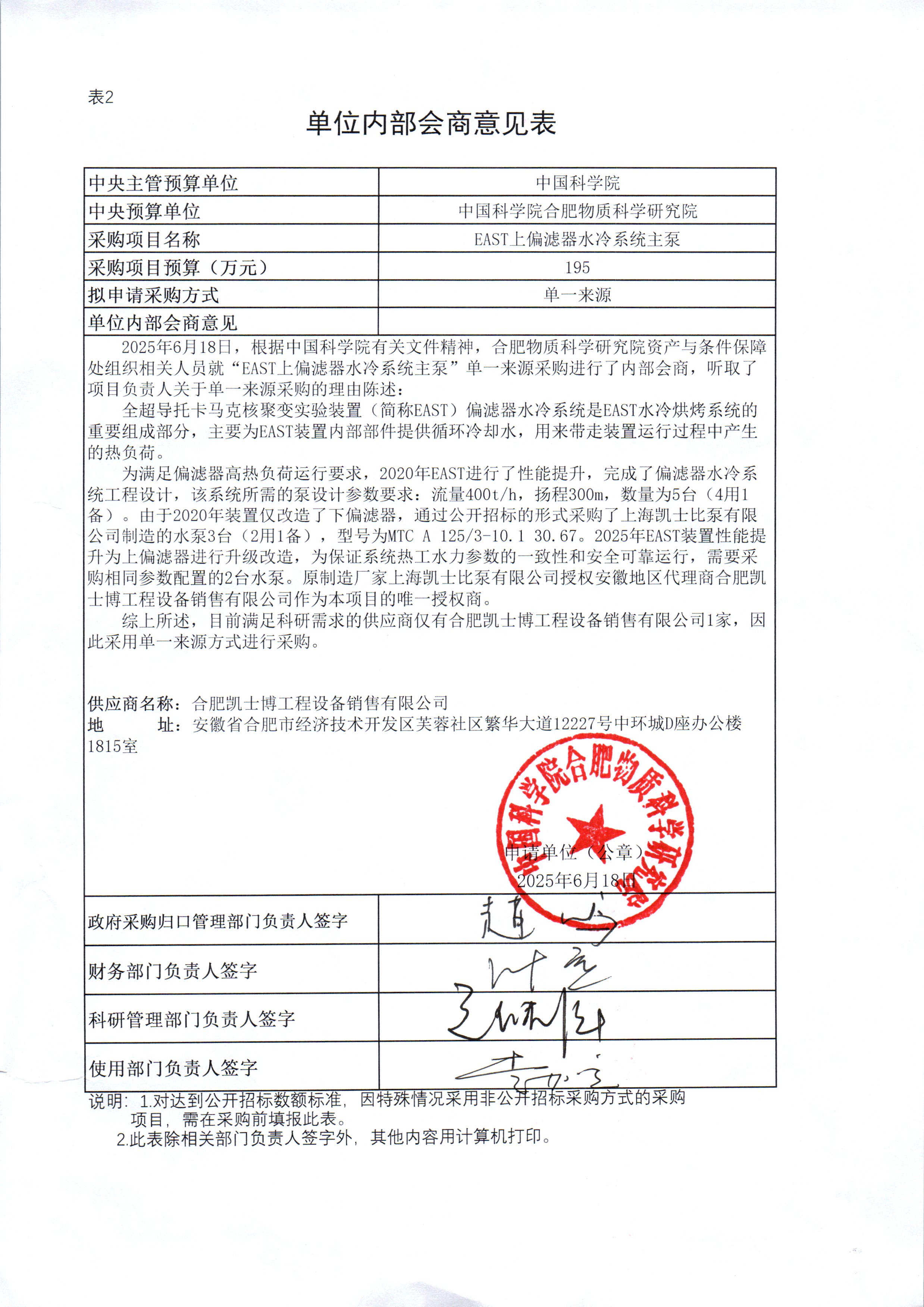[公示已结束]关于《EAST上偏滤器水冷系统主泵》采用单一来源采购方式的单位内部会商意见的公示(2025.6.23-2025.6.30)