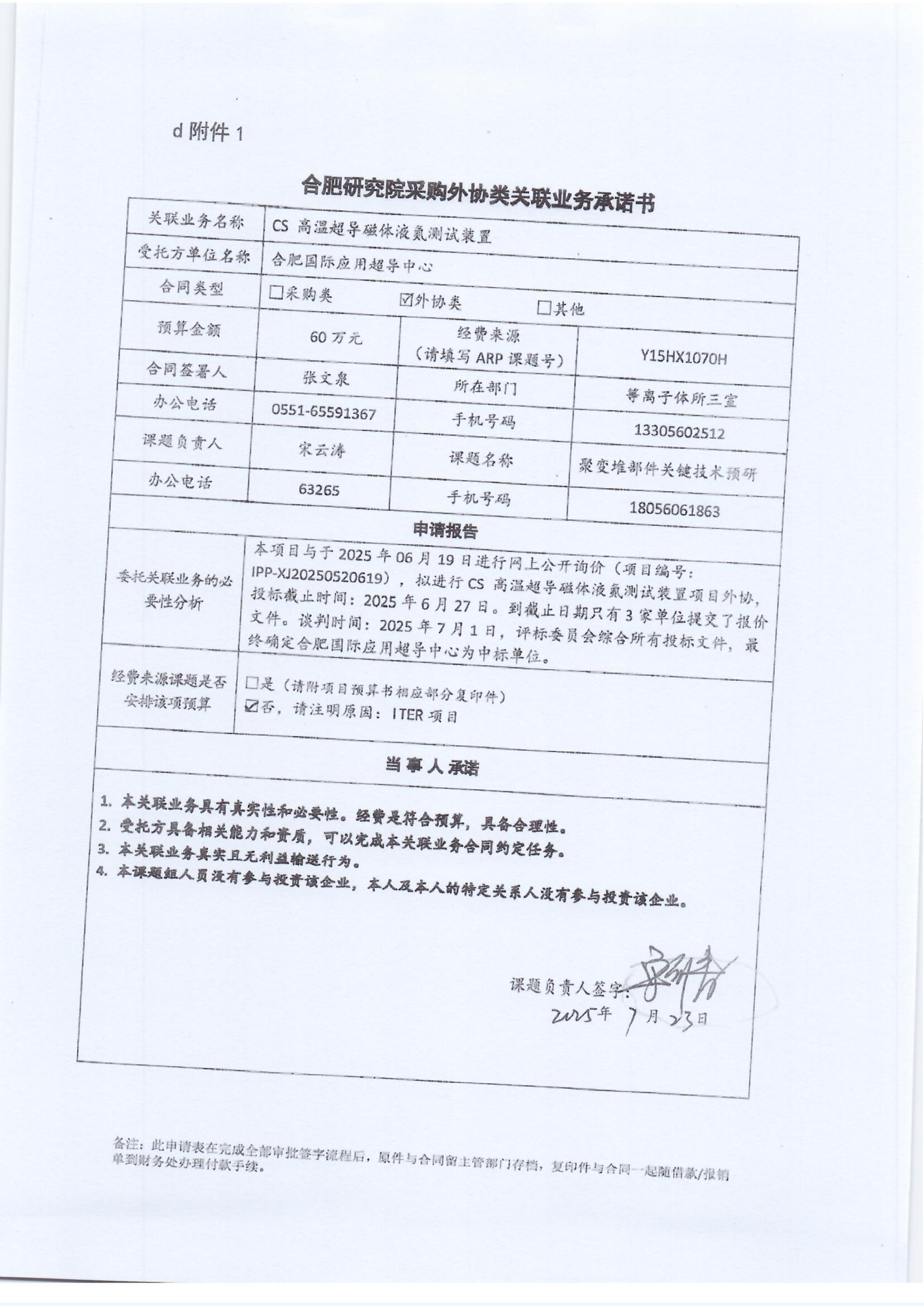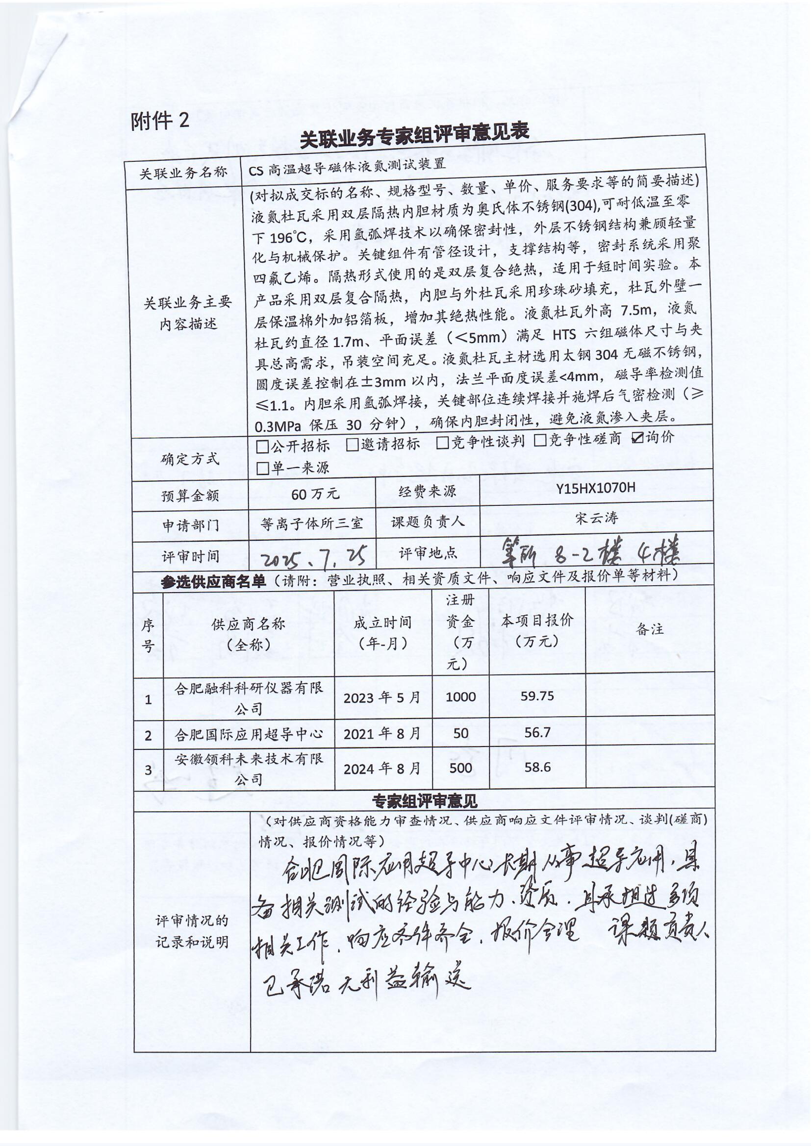 根据《中国科学院关于加强科研项目关联业务管理的暂行规定》(科发条财字〔2015〕125号)、《中国科学院合肥物质科学研究院关于加强科研项目关联业务管理的实施细则》(科合院发资字〔2021〕8号)、《合肥研究院加强关联业务管理暂行办法》(科合院发资字〔2022〕1号)、《合肥物质院加强关联业务管理补充规定》(科合院发资字〔2025〕1号)要求,现就我院向合肥国际应用超导中心采购CS高温超导磁体液氮测试装置外协服务做关联业务公示。