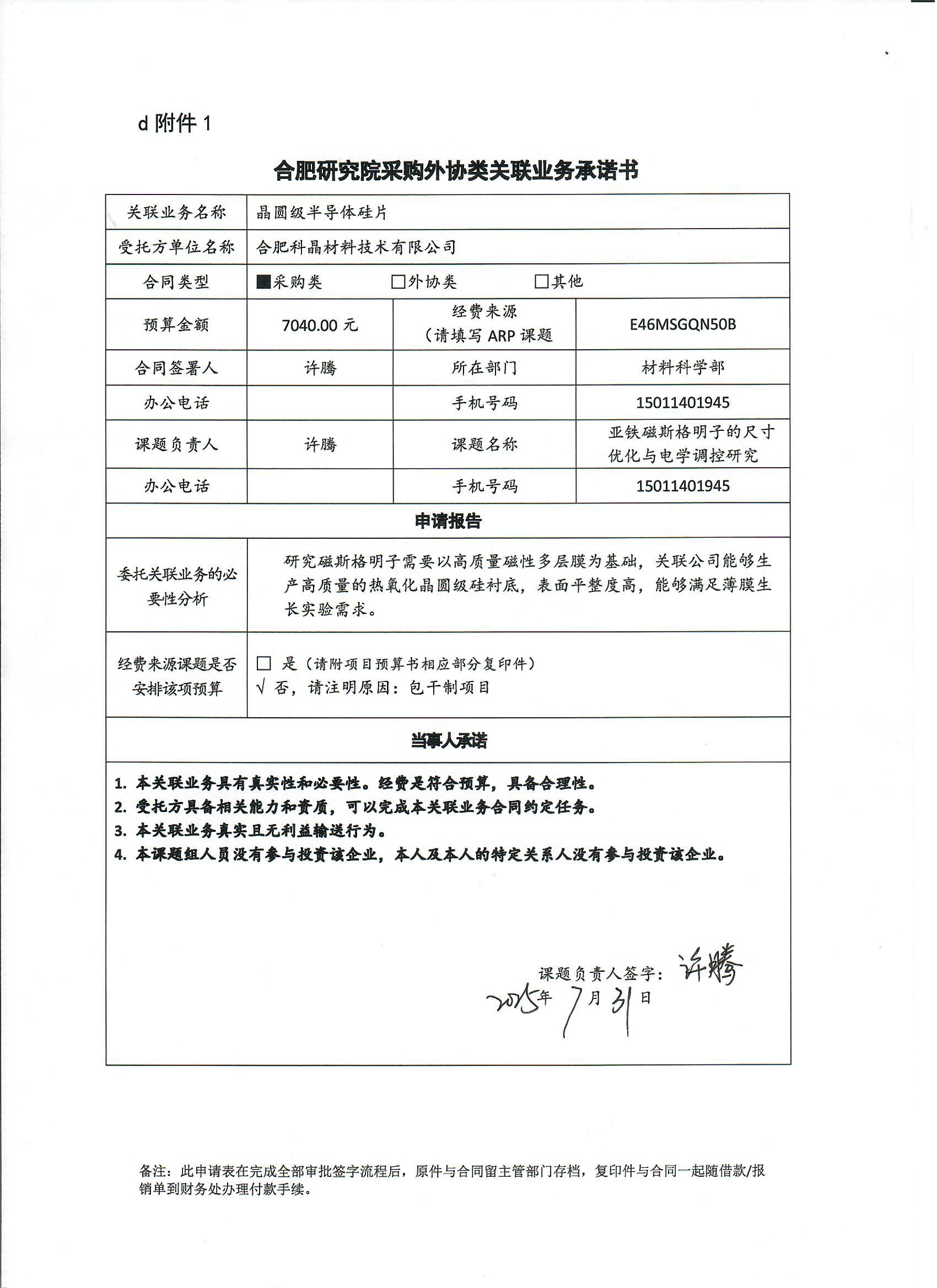 中国科学院合肥物质科学研究院强磁场科学中心杜海峰老师课题组向合肥科晶材料技术有限公司购买晶圆级半导体硅片,研究磁斯格明子需要以高质量磁性多层膜为基础,关联公司能够生产高质量的热氧化晶圆级硅衬底,表面平整度高,能够满足薄膜生长实验需求。合肥科晶材料技术有限公司是由合肥科学岛控股有限公司与材料技术国际公司合资成立,合肥科学岛控股有限公司占股19.77%,本次采购构成关联业务交易。
