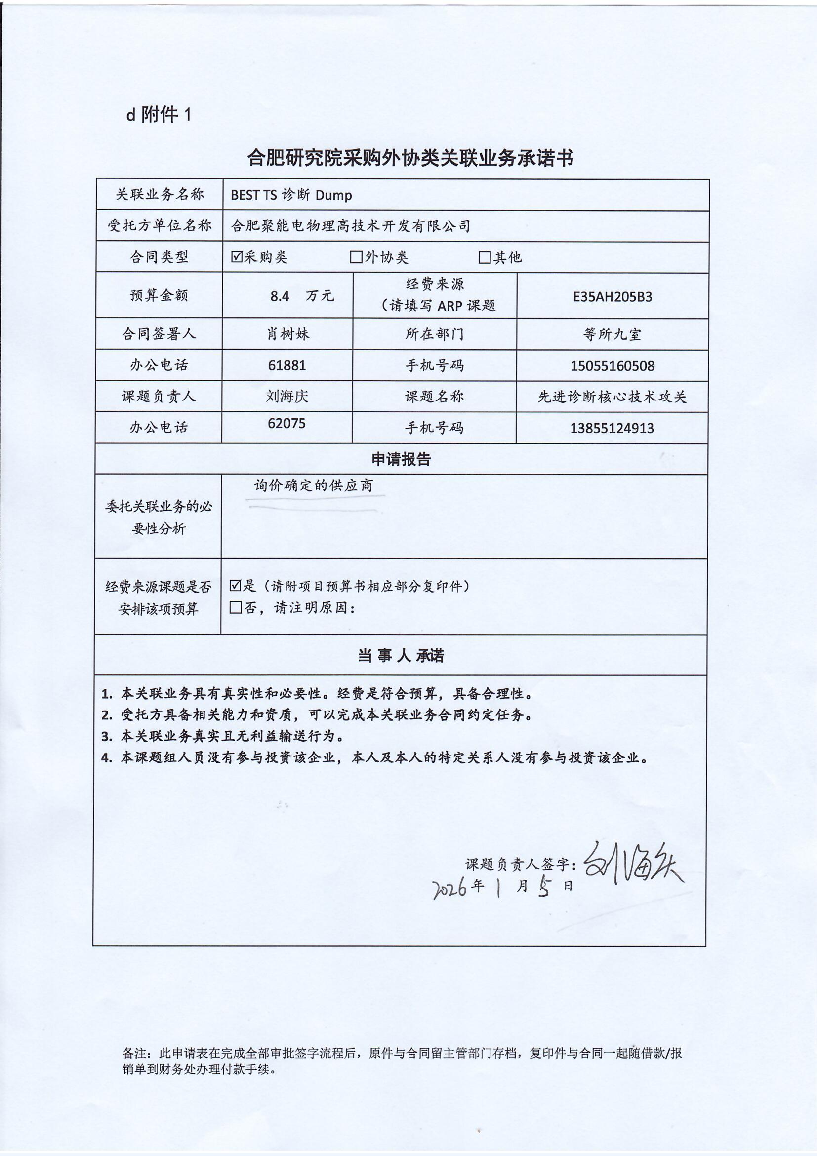 根据《中国科学院关于加强科研项目关联业务管理的暂行规定》(科发条财字〔2015〕125号)、《中国科学院合肥物质科学研究院关于加强科研项目关联业务管理的实施细则》(科合院发资字〔2021〕8号)、《合肥研究院加强关联业务管理暂行办法》(科合院发资字〔2022〕 1号)、《合肥物质院加强关联业务管理补充规定》(科合院发资字〔2025〕1号)要求,现就我院从合肥聚能电物理高技术开发有限公司采购BEST TS诊断Dump的关联业务做公示。