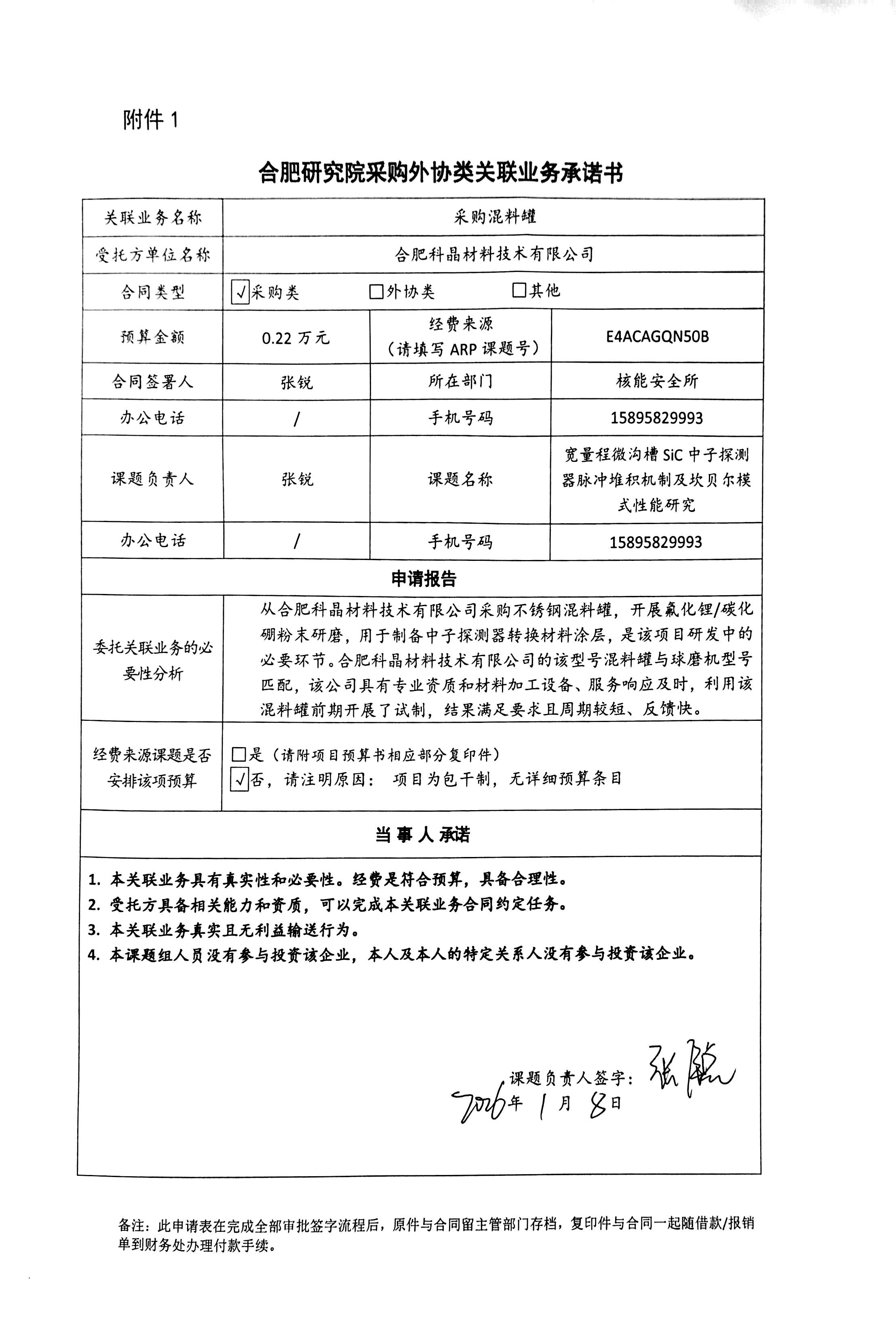 中国科学院合肥物质科学研究院核能安全技术研究所张锐老师委托合肥科晶材料技术有限公司采购混料罐。该型号混料罐与球磨机匹配,用于开展氟化锂/碳化硼粉末研磨,该材料用于制备高性能中子探测器,是项目研发的必要环节。合肥科晶材料技术有限公司是由合肥科学岛控股有限公司与材料技术国际公司合资成立,合肥科学岛控股有限公司占股19.77%,本次采购构成关联业务交易。