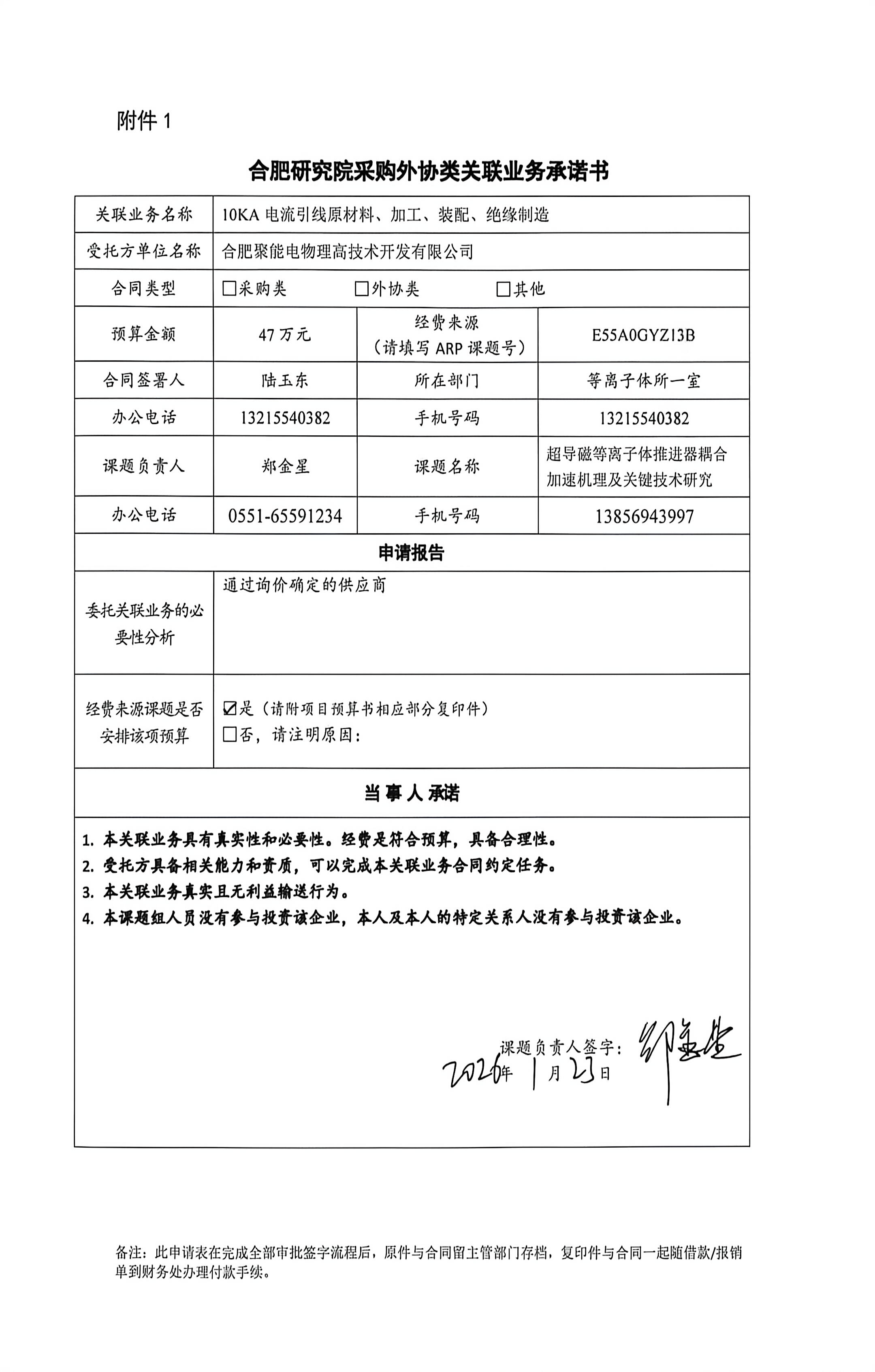 根据《中国科学院关于加强科研项目关联业务管理的暂行规定》(科发条财字〔2015〕125号)、《中国科学院合肥物质科学研究院关于加强科研项目关联业务管理的实施细则》(科合院发资字〔2021〕8号)、《合肥研究院加强关联业务管理暂行办法》(科合院发资字〔2022〕 1号)、《合肥物质院加强关联业务管理补充规定》(科合院发资字〔2025〕1号)要求,现就我院委托合肥聚能电物理高技术开发有限公司进行10KA电流引线原材料、加工、装配、绝缘制造的关联业务做公示。