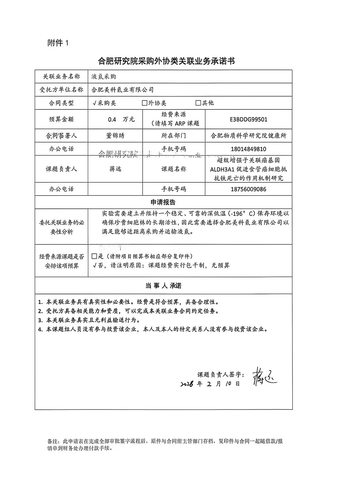 根据《中国科学院关于加强科研项目关联业务管理的暂行规定》(科发条财字〔2015〕125号)、《中国科学院合肥物质科学研究院关于加强科研项目关联业务管理的实施细则》(科合院发资字〔2021〕8号)、《合肥研究院加强关联业务管理暂行办法》(科合院发资字〔2022〕 1号)、《合肥物质院加强关联业务管理补充规定》(科合院发资字〔2025〕1号)要求,现就我院从合肥美科氦业有限公司购买1000L液氮的关联业务做公示。
