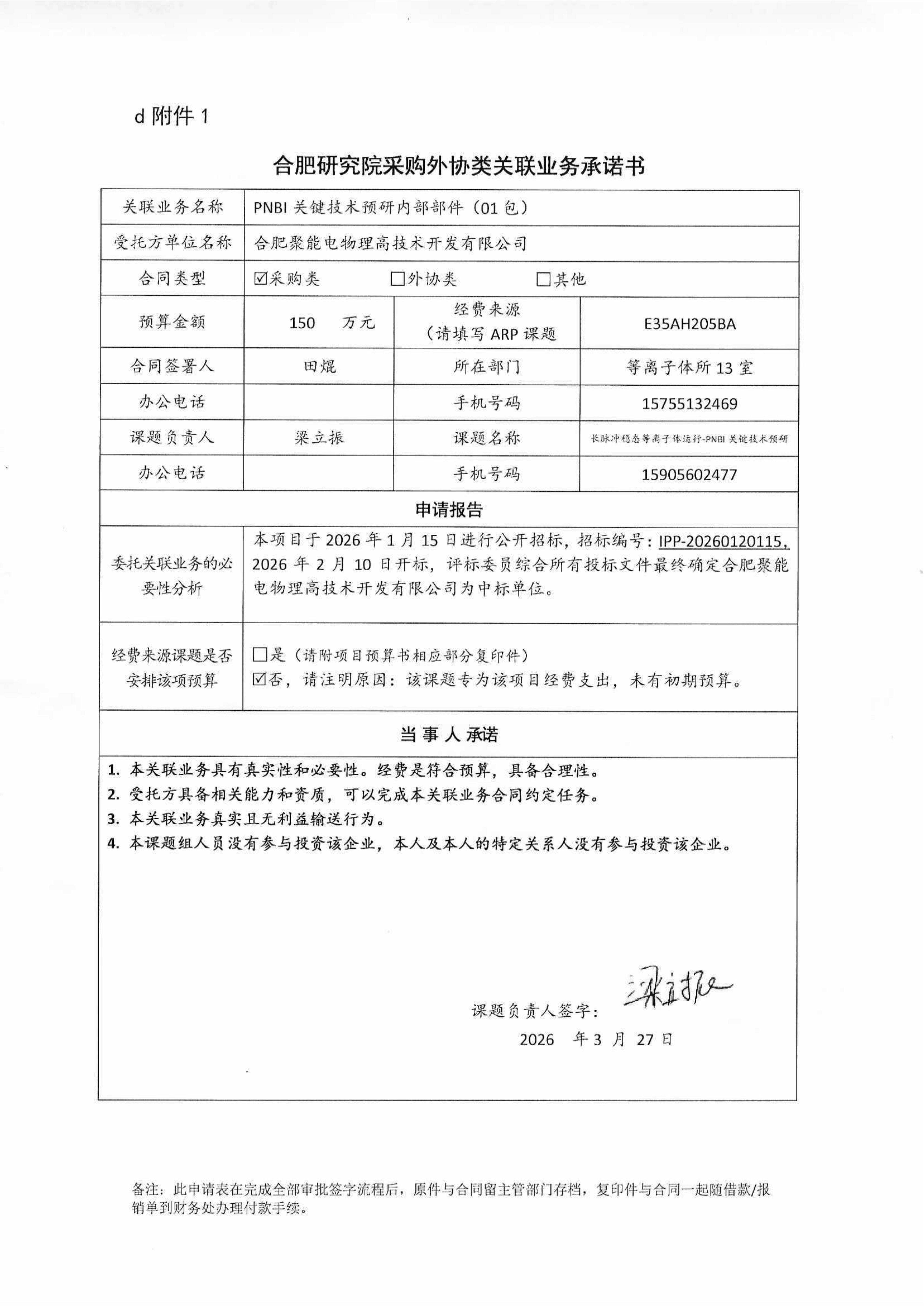 根据《中国科学院关于加强科研项目关联业务管理的暂行规定》(科发条财字〔2015〕125号)、《中国科学院合肥物质科学研究院关于加强科研项目关联业务管理的实施细则》(科合院发资字〔2021〕8号)、《合肥研究院加强关联业务管理暂行办法》(科合院发资字〔2022〕 1号)、《合肥物质院加强关联业务管理补充规定》(科合院发资字〔2025〕1号)要求,现就我院委托合肥聚能电物理高技术开发有限公司进行PNBI关键技术预研内部部件(01包)的关联业务做公示。