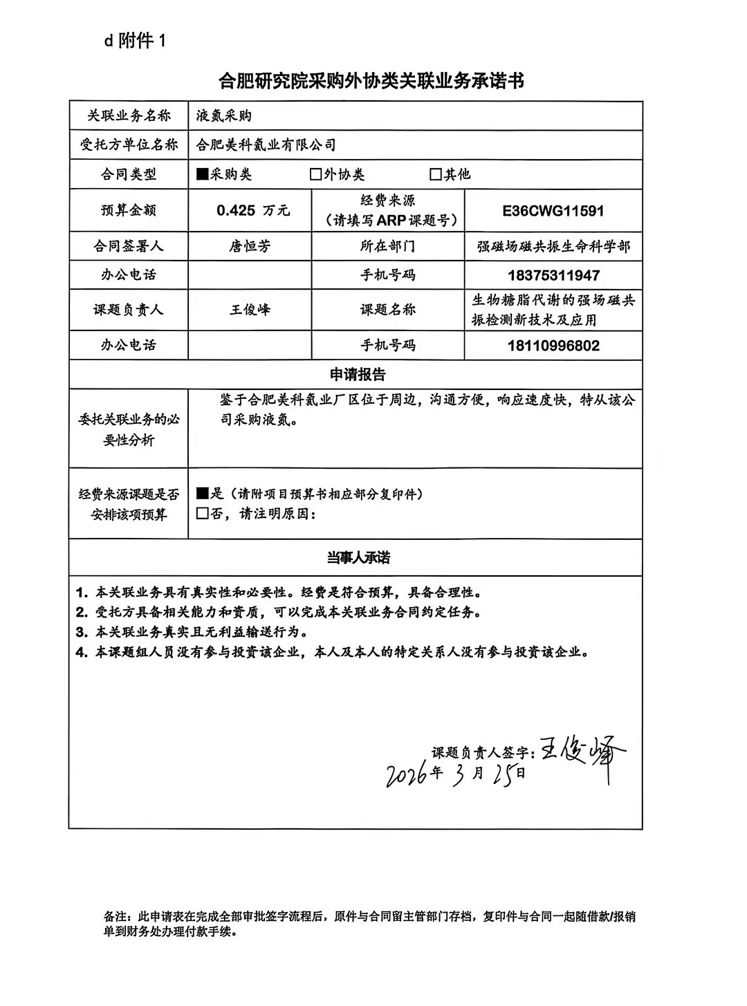 根据《中国科学院关于加强科研项目关联业务管理的暂行规定》(科发条财字〔2015〕125号)、《中国科学院合肥物质科学研究院关于加强科研项目关联业务管理的实施细则》(科合院发资字〔2021〕8号)、《合肥研究院加强关联业务管理暂行办法》(科合院发资字〔2022〕 1号)、《合肥物质院加强关联业务管理补充规定》(科合院发资字〔2025〕1号)要求,现就我院从合肥美科氦业有限公司采购液氮1000L的关联业务做公示。