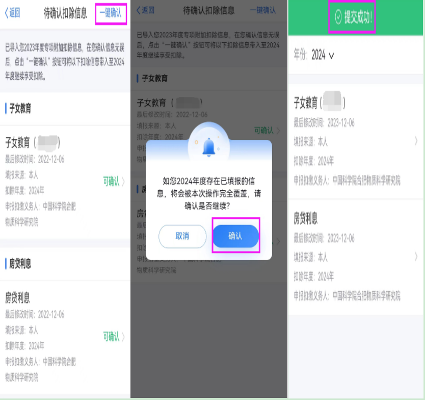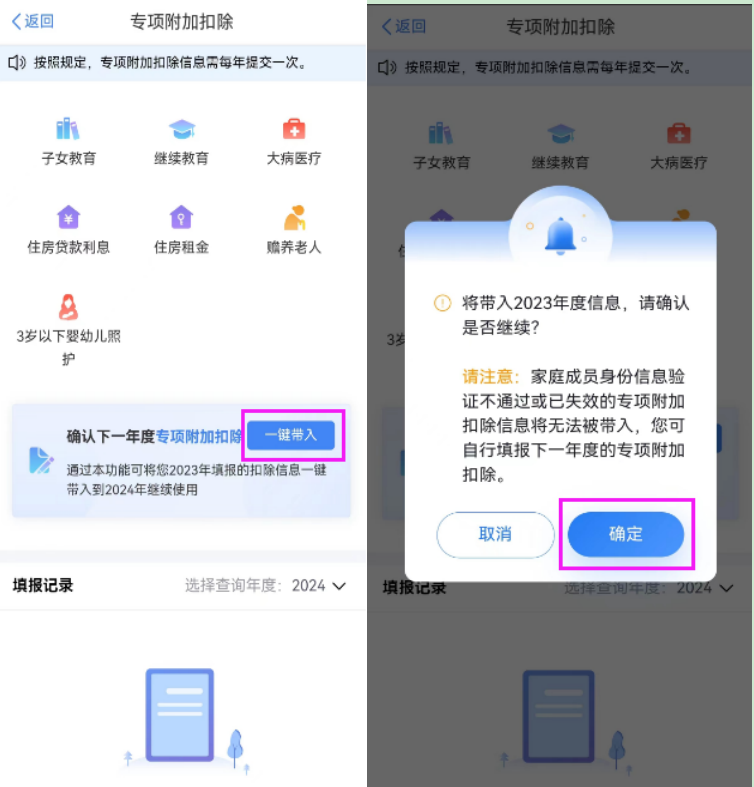 根据《国家税务总局关于修订发布<个人所得税专项附加扣除操作办法 (试行) >的公告》(国家税务总局公告〔2022〕7号)规定,纳税人需在2023年12月31日前,对2024年的专项附加扣除进行确认。请您尽快进入个人所得税APP进行查看。