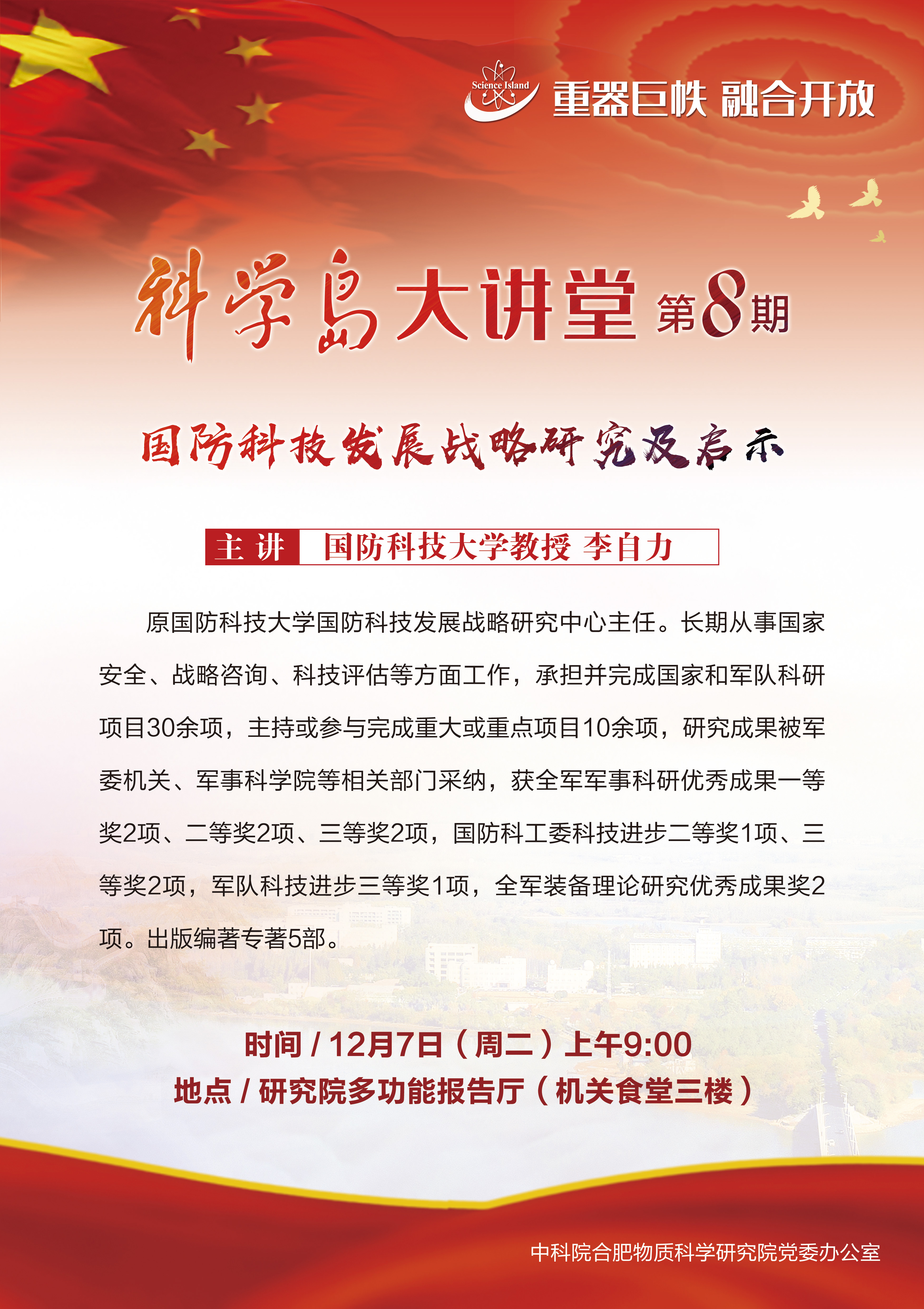 为深入开展党史学习教育,学习贯彻党的十九届六中全会精神,促进“重器巨帙、融合开放”的创新文化建设,中科院合肥研究院拟于近期举办第八期“科学岛大讲堂”。