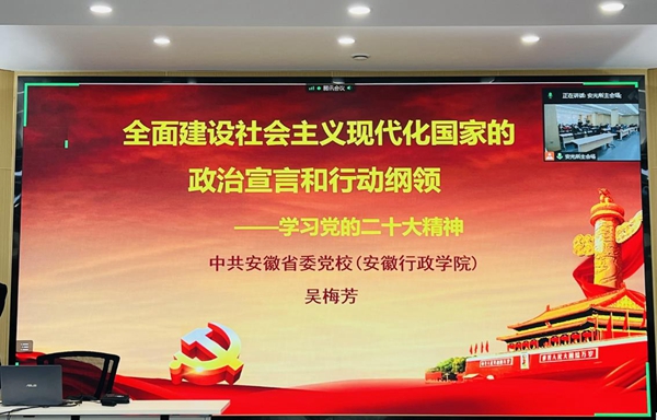 12月1日上午,安徽光机所党委举办党的二十大精神宣讲报告会,安徽省直机关二十大宣讲团专家、中共安徽省委党校党建教研部主任吴梅芳教授应邀向安光所全体党员宣讲党的二十大精神。报告会由安光所党委书记谢品华主持,会议设主会场及七个线上分会场,全所共220余名党员同志参会。