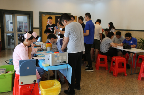 7月25日-26日,各献血点一片繁忙,填表、登记、体检、测血样,体检合格者高兴的奔向献血车接收采血。部分科研工作者正值实验期间,由于熬夜造成体检不合格,带着深深的遗憾离开献血点。活动期间四个站点的团委人员积极参与了献血现场工作,维持现场秩序,配合血站工作人员开展献血工作,并热情地为献血志愿者们服务,保证献血工作正常有顺的进行。