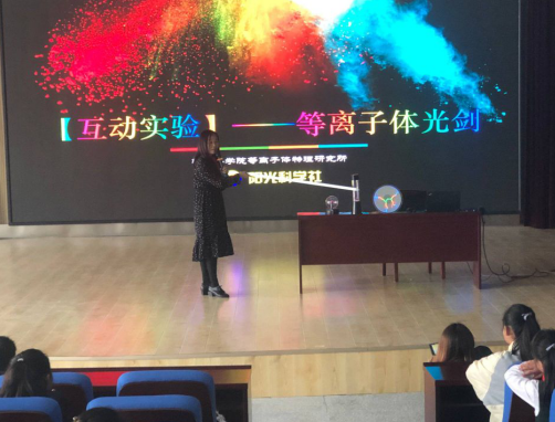张素贞博士用精美的图片和相关视频,深入浅出地为五年级的学生介绍了 “人造太阳”研究背景、研究内容和现阶段取得的成果。讲座期间,张素贞与学生们互动提问,现场气氛活跃,学生听得兴致盎然。张素贞还自带仪器现场为同学们演示“等离子体光剑”实验,让学生大开眼界,惊呼神奇。