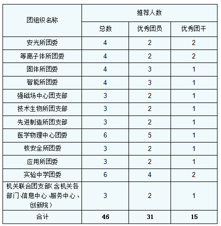 优秀团员、优秀团干部和优秀团组织的评选,采取自下而上逐级审核、申报的方式。此次拟表彰若干个优秀团组织和优秀团员、团干部。优秀团组织各单位择优申报。优秀团员和团干的具体推荐人数见下表: