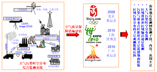 准确全面的掌握大气环境污染状况,认识其发展和演变规律是大气防治的基础。项目研发了一批地基、车载和机载大气环境污染时空分布监测设备,并通过技术转化实施了产业化。主要创新是创建了重要大气污染物光谱特征数据库,提出了相应污染物浓度反演算法和数值解析模型,利用自主技术构建了城市大气污染时空分布监测技术系统,并在北京奥运、上海世博和广州亚运等典型城市大气环境综合立体监测中得到应用示范,弥补和扩充了例行业务监测网络在监测手段、监测内容和监测范围的不足。促进了我国环境监测仪器新兴产业的发展,为揭示大气污染的形成、来源和输送等提供了强有力的技术支持,将为我国城市大气复合污染治理和环境空气质量改善提供科技支撑。