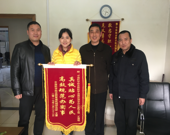 2月27日下午,智能所职工王慧博士向服务中心园区治安办送来一面印有“高效规范办实事,真诚贴心为人民”的锦旗,表达对治安办工作人员帮其找回丢失物品的感激之情。