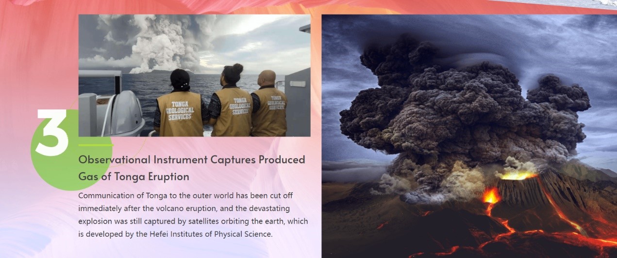 在中科院2022年度第一季度英文网站新闻盘点中,合肥研究院“高光谱观测卫星监测到汤加火山喷发产生的二氧化硫气团”和 “城市HOx自由基观测与模拟研究取得重要进展”入选最受欢迎科研成果英文报道TOP10。