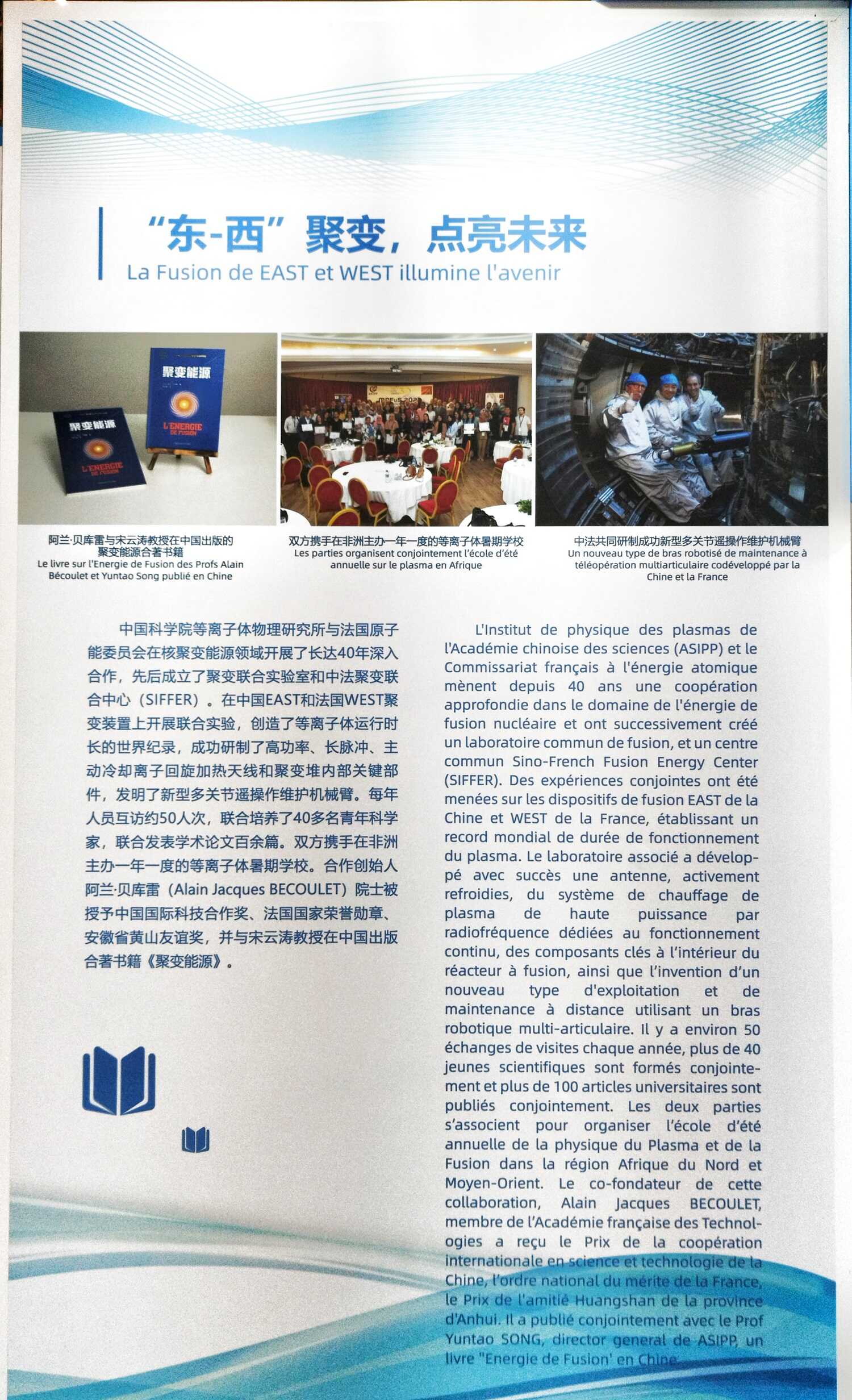 合肥物质院与法国原子能委员会(CEA)在核聚变能源领域开展了长达40年深入合作,先后成立了聚变联合实验室和中法聚变联合中心。合作创始人阿兰·贝库雷,法国国家技术科学院院士、国际热核聚变实验堆(ITER)组织副总干事、CEA磁约束聚变研究所前所长被授予中国科技国际合作奖、法国国家荣誉勋章、安徽省黄山友谊奖,并与宋云涛副院长在中国出版合著书籍《聚变能源》。双方在中国EAST和法国WEST聚变装置上开展联合实验,创造了等离子体运行时长的世界纪录,成功研制了高功率、长脉冲、主动冷却离子回旋加热天线和聚变堆内部关键部件,发明了新型多关节遥操作维护机械臂,并携手在非洲主办一年一度的等离子体暑期学校。