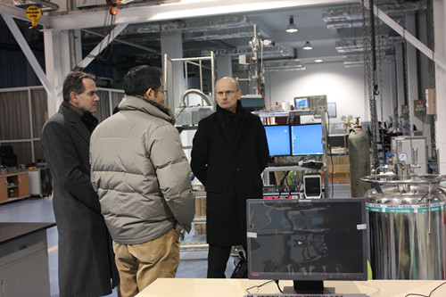 在强磁场中心中心副主任田长麟研究员的陪同下,两位外交官先后参观了磁体大厅、装备大厅、热处理设施和有关测系统。在水冷磁体实验室,由强磁场科学中心高秉钧研究员研制的水冷磁体核心部件“比特片”受到客人的高度关注。通过参观和交流,客人们对稳态强磁场实验平台科学研究的意义和作用等背景有了更全面和深刻的认识,他们表示希望今后加强中法两国在该领域的合作,相互借鉴,取长补短,为提升科技创新能力,造福人类携手共进。