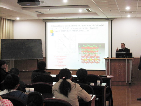 访问期间,朱斌教授作了题为“当今燃料电池的挑战和机遇”的研究报告,详细描述了当今燃料电池发展遇到的技术性问题以及低温固体氧化物燃料电池在纳米复合材料制备先进无电解质中的优越性,并给出了基于H+/O2-离子双向传导的机理描述。在学术报告中,大家对无电解质燃料电池涉及的领域进行了讨论和交流。