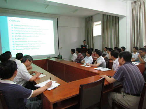 Chang博士和Lee博士均是韩国原子能研究所核聚变实验装置中性束注入研究项目的专家,访问期间,两位专家与等离子体所相关科研人员及研究生就中性束注入领域的研究课题展开了深入探讨和广泛交流。Chang博士应邀做了题为“Arc Discharge Characteristics and Beam Extraction Results of KSTAR Prototype LPIS ”的学术报告,介绍了KAERI装置中性束注入系统的发展历程与未来发展规划,以及中性束注入系统内部部件的结构、弧放电特性、束引出实验结果,并将KAERI与EAST的中性束注入系统参数进行了对比,期望今后双方在中性束注入研究领域展开更深层次的人员合作与学术交流。此行,两位专家还参观了等离子体所中性束注入实验室,了解了所中性束注入系统相关工作的进展和情况。