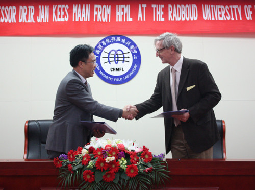 2012年11月23日,荷兰奈梅亨强磁场实验室主任Prof. Jan Kees Maan与中科院强磁场中心主任匡光力研究员在合肥签署合作协议,双方达成共识,今后将在技术装置利用、数据共享、实验室开放、人员互访交流等方面开展密切合作。该协议的签署,标志着两个国家强磁场实验室的实质性合作迈出了第一步。