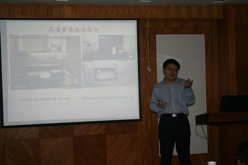 高通量筛选(High throughput screening,HTS)技术可以在同一时间检测成百上千个样品,通过一次平行实验获得大量的信息,并从中找到有价值的信息。报告会上,黄德建副教授首先对高通量筛选法的原理和研究方法进行了深入细致的介绍,讲述了通过高通量筛选法对数百味传统中草药进行系统性研究并成功筛选和分离出高选择性的淀粉水解酶抑制剂龙黄烷B和高活性的抗衰老天然产物隐丹参酮的研究过程,并介绍了以酵母为模型的抗衰老活性快速评估法,以及上述研究成果对开发基于中草药的新一类抗高血糖和抗衰老药物的重要应用价值。报告中,黄德建副教授对于抗氧化物质的提取和应用以及面临的问题和挑战发表了精辟、独到的见解,讲解生动简洁,赢得了到场研究人员的阵阵掌声。大家对相关问题进行了热烈的讨论,气氛十分活跃。