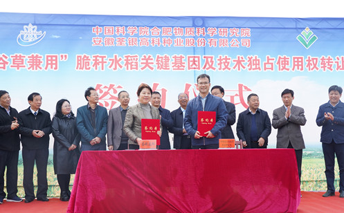 合肥研究院科技促进发展处处长邓国庆和张琴代表双方签署了“谷草兼用”脆秆水稻关键基因及技术转化协议。合肥研究院党委副书记邹士平以及荃银高科、省农业农村厅、省农科院、安徽农业大学等单位相关领导和专家参加签约仪式及示范现场观摩会。
