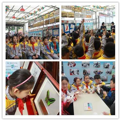 活动分为科学表演秀、趣味科学实验、蝴蝶标本动手做、珍稀蝴蝶标本展示等部分。安徽省科技馆同行的科学表演秀和趣味科学实验让孩子近距离观察到学校实验室无法实现的科学原理和现象,孩子们积极踊跃的举手回答着每一个科学小问题;精挑细选的30件美丽的蝴蝶标本也让孩子们的想象力插上了翅膀,不由自主地模仿起蝴蝶翩翩起舞,最让他们开心的是特别为每一个孩子准备的蝴蝶贺卡和蝴蝶面具,一拿到面具和贺卡,大家就趴在桌子上认真做了起来,孩子们的兴奋让在一旁为他们服务的工作人员脸上也露出欣慰的表情。