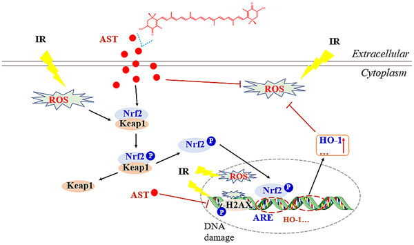 本研究主要围绕虾青素对γ射线辐射诱导的强氧化应激下的正常细胞的保护作用机制进行,科研人员以BHK-21和CHO-K1细胞为模型,以γ辐射为引起强氧化应激,研究虾青素对细胞的保护作用并初步探讨其机制。结果表明,与辐射条件下未经虾青素处理相比,虾青素提高了细胞在辐射条件下的细胞活力,减少了辐射引起的细胞凋亡和DNA损伤,降低了细胞内的活性氧(Reactive oxygen species,ROS)。进一步研究发现,虾青素通过激活Nrf2信号通路,上调与抗氧化相关的蛋白HO-1、p-Nrf2水平,减缓电离辐射引起的氧化应激。因此,这项研究不仅提供了虾青素非凡的抗氧化性能的证据,而且还可能扩大其在辐射防护领域的应用。