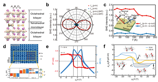 清华大学于浦教授课题组提出以氧多面体作为材料物性调控基元,从而有效拓展了新型量子物态的研究思路。通过对氧空位序的原子精度操控,他们创制出一种全新的具有准二维结构的功能氧化物—Ca3Co3O8。该材料综合了双层Ruddlesden-Popper(RP)结构和BM结构的基本特征(图1a)。随后,他们与中国科学院合肥物质院强磁场中心盛志高研究员团队合作,依托SHMFF超快非线性光学测试系统,采用二次谐波产生技术从宏观上证明Ca3Co3O8中存在显著的电极化序(图1b)。该结果与电子叠层成像的微观结构观察相结合(图1d),发现了电极性的主要贡献来自于双层CoO6八面体中Co离子的位移。同时,SHMFF超快二次谐波产生的温度依赖测量结果显示,该材料的电极化在磁转变温度以下明显增强,表明了电极性和磁性间的耦合关联作用(图1c)。此外,八面体层还兼具铁磁性和金属性,使得Ca3Co3O8中体现出铁磁性、电极化与巡游电子间的强耦合关联。Ca3Co3O8中的铁磁极化金属态为研究金属体系中的磁电耦合效应提供了理想研究平台。