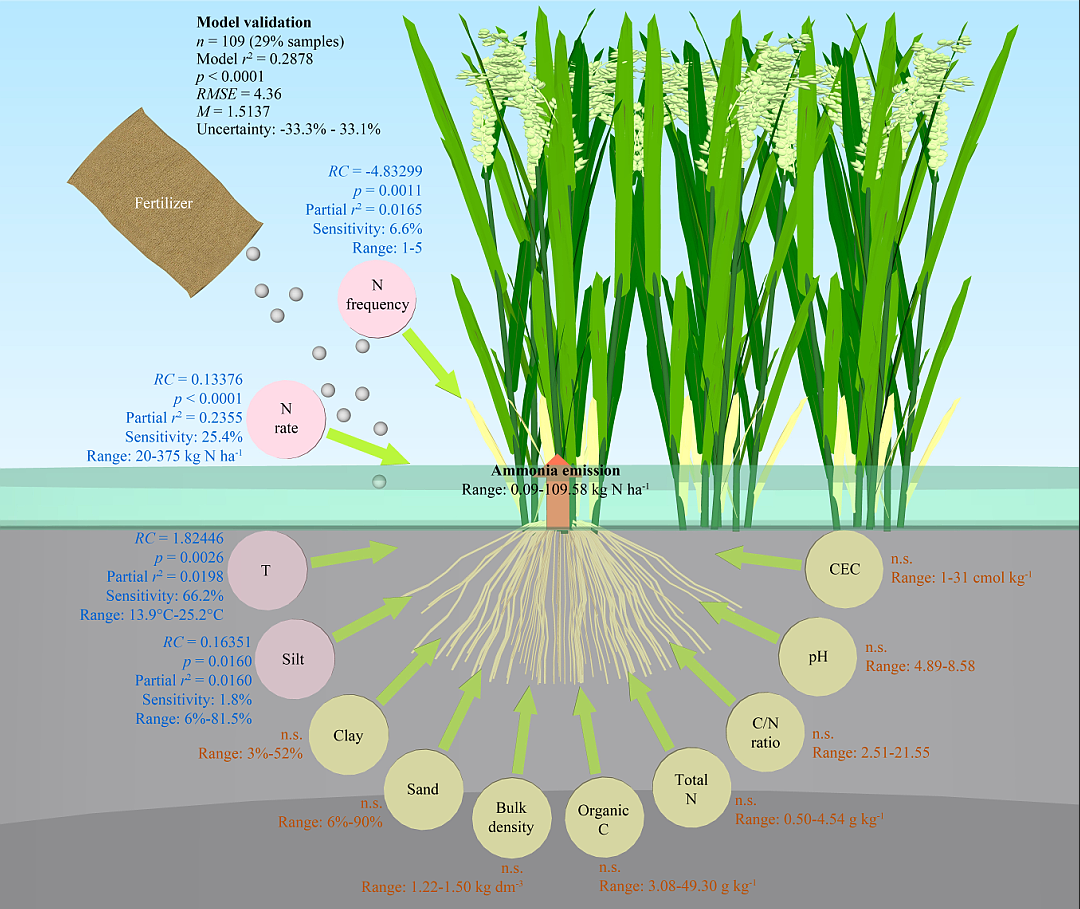 团队依托安徽省环境友好高效化肥农药工程研究中心,联合共建单位收集我国稻田氨挥发等数据,建立稻田氨挥发、土壤性质与施氮量数据集,采用逐步剔除方法探明影响稻田氨挥发的关键因素,建立不同地理尺度的氨挥发评估模型。研究结果表明,施氮量、施氮次数、地表温度和土壤粉粒含量是影响稻田氨挥发的关键驱动因素。