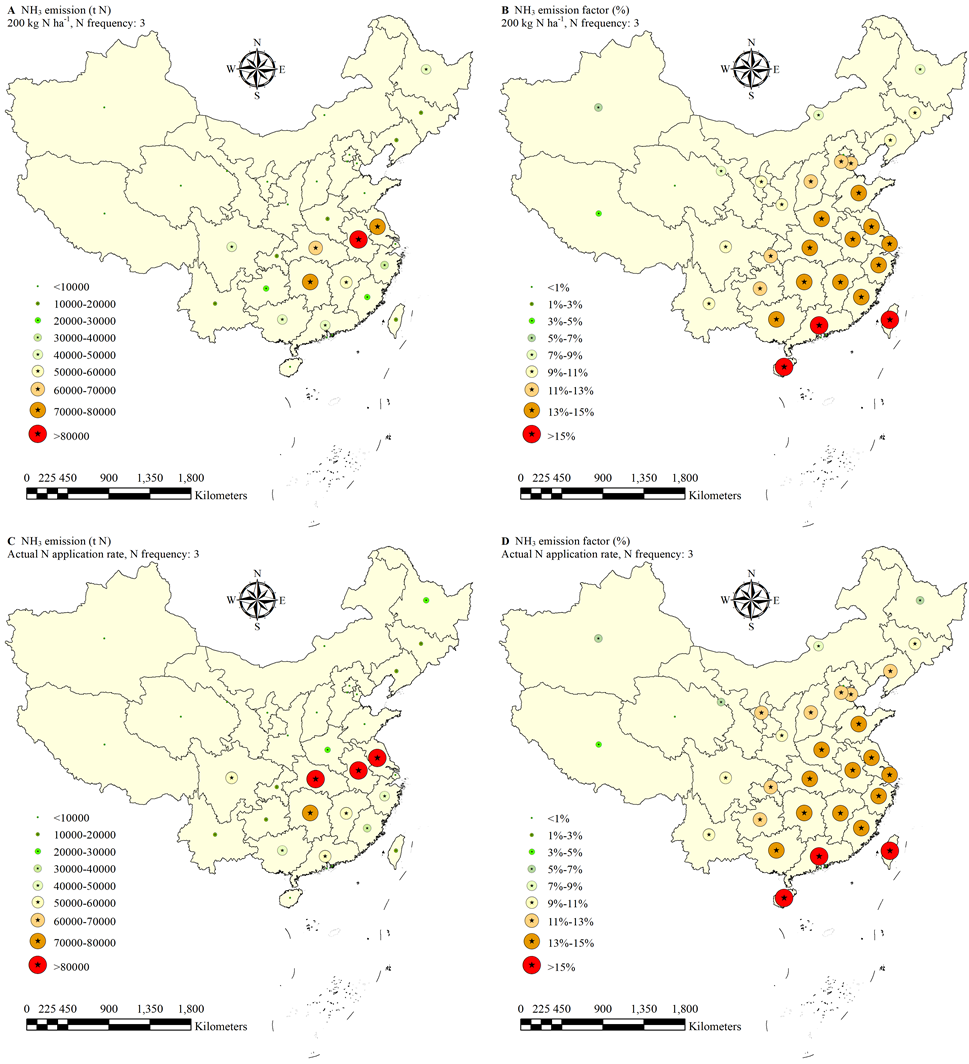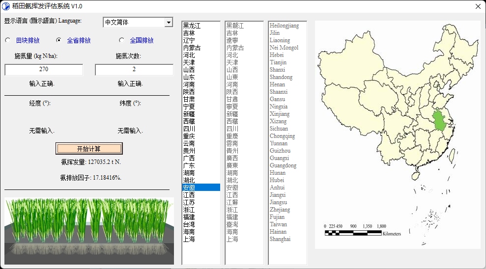 在190-210 kg N ha-1的施氮量下,水稻丰产与氨挥发减排的综合效益最佳。在实际施氮量下,我国每个水稻季的氨挥发损失量约为85.2万吨(折纯氮),氨排放因子约为12.7%。湖北、安徽、江苏等省份的稻田氨挥发总量较高,广东、海南、台湾等省份的稻田氨排放因子较高。在此背景下,团队融合基础数据集和氨挥发核心算法,进一步开发“稻田氨挥发评估系统V1.0”,可以在田块、全省及全国三种地理尺度下评估稻田氨挥发量和氨排放因子,为优化施肥策略、减少氨排放、及开展农业与环境科学研究提供依据。