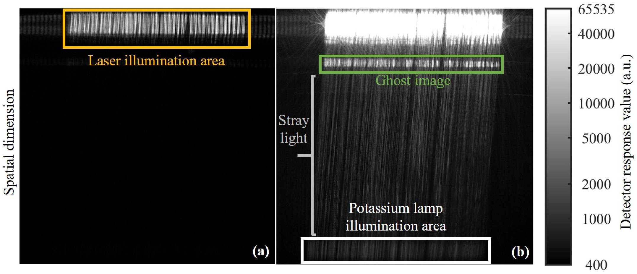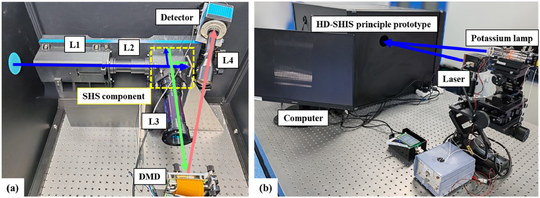 HD-SHIS通过调整DMD微镜的翻转时间来控制每个视场信号的曝光时间,实现视场内强弱信号同时探测;同时,HD-SHIS利用DMD实现干涉数据的Hadamard调制,提升弱光信噪比。研究人员利用自研的HD-SHIS原理样机,进行了动态范围实验验证,利用8 bit的DMD实现了48 dB动态范围的提升。本研究提出的HD-SHIS能够有效提升超光谱成像探测中的动态范围,也可应用至其他干涉型光谱仪中,具有重要的科学意义和应用前景。